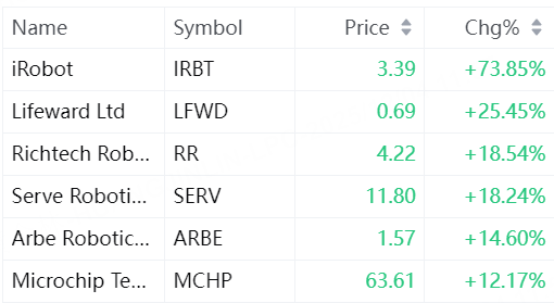 龙头股 特斯拉 大涨4%, Nauticus Robotics, Inc.暴涨115.9%, iRobot Corp. 飙升73.8%,英伟达入股的送货机器人 Serve Robotics Inc. 则涨18.2%。