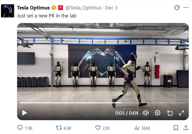 12月3日,特斯拉擎天柱(Optimus)团队公布了一段「擎天柱」机器人跑步的短视频。特斯拉的这款人形机器人以类人跑姿,快速从画面左侧跑到右侧。该团队配文称:「刚在实验室刷新了个人纪录」。
