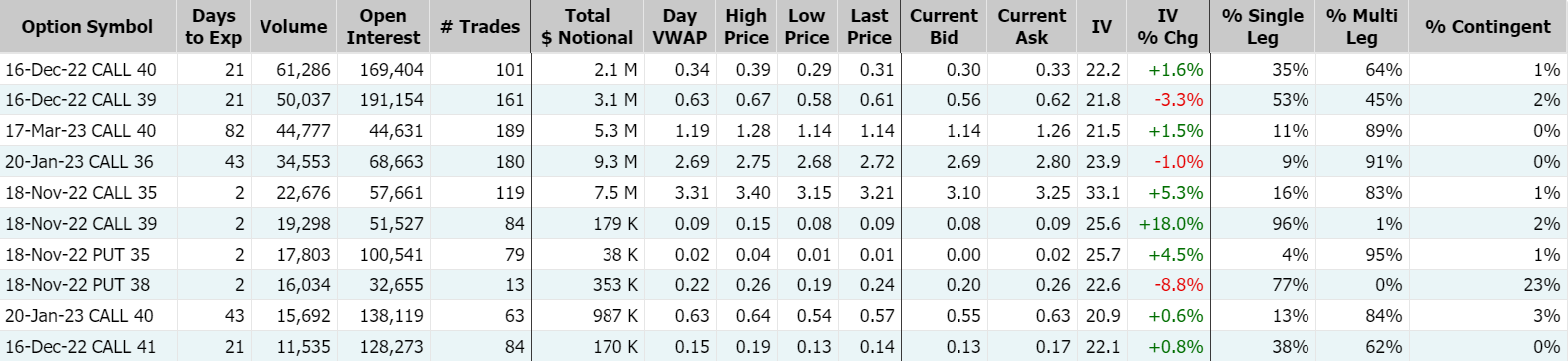 新兴市场ETF-iShares MSCI周三期权成交373,881张合约,其中看涨期权占比77.6%。其中2022年12月16日到期的40美元行使价看涨期权的成交量特别高,成交量为61,286张。