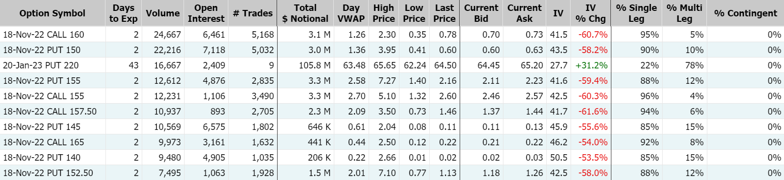 塔吉特周三暴跌逾13%,Q3利润腰斩且逊预期,下调Q4业绩指引。周三期权成交416,932张合约,较前一交易日翻倍,其中2022年11月18日到期的150美元行使价看跌期权的成交量特别高,成交量为22,216张。