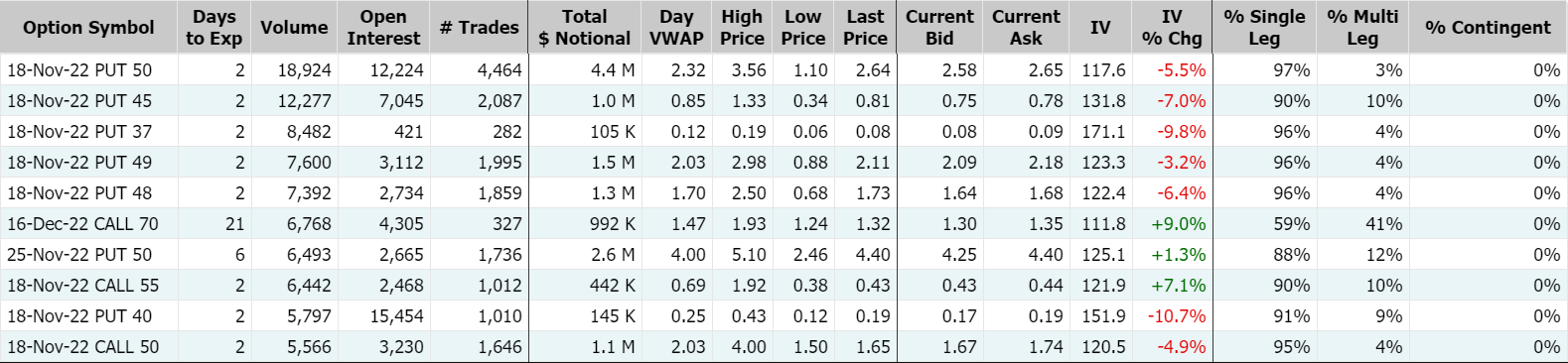 Coinbase周三重挫逾12%,期权成交292,072张合约,其中看跌期权占比近70%,其中2022年11月18日到期的45美元行使价看跌期权的成交量特别高,成交量为12,277张。