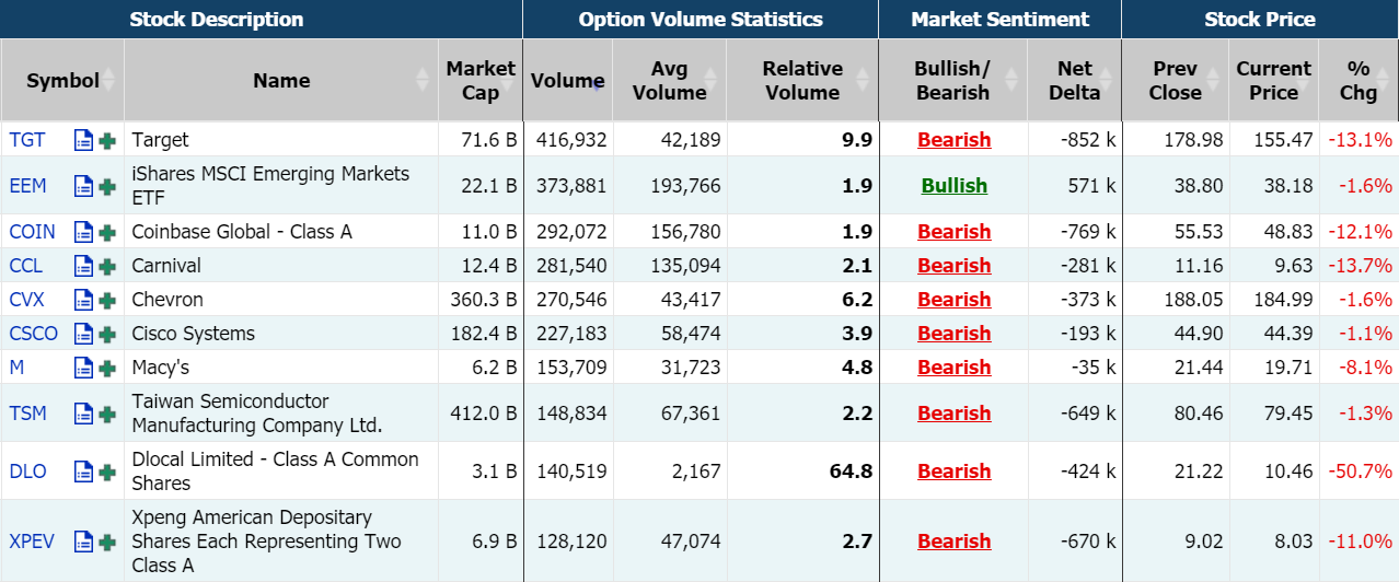 周三,期权市场总成交量达37,323,100张合约,较前一交易日下降近20%,且低于90日平均成交量;塔吉特业绩暴雷,股价暴跌逾13%;期权成交416,932张合约,较前一交易日翻倍;Coinbase股价重挫逾12%,期权成交292,072张合约,其中看跌期权占比近70%。