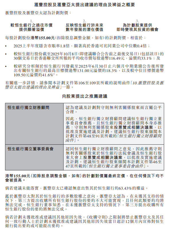 汇丰控股:对恒生银行私有化方案的拟定对价为155港元/股