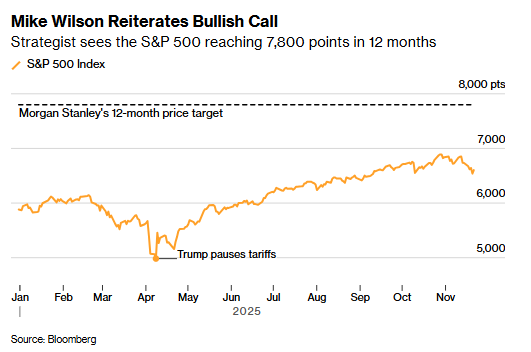 近段时间以来,由于对AI泡沫担忧加剧,同时美联储12月降息前景存疑,由科技股主导的美国股市持续遭遇抛售。然而,这并没有影响华尔街对股市未来走势的乐观预期,摩根士丹利与德意志银行近日相继发表看涨观点,认为当前跌势已近尾声,并看好明年美股将持续走强,标普500指数有望再创新高。