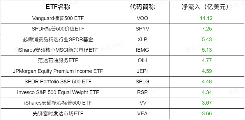 上周多只追踪标普500指数的ETF净流入居前,其中,Vanguard标普500 ETF在上周流入金额为14.12亿美元,净流入TOP10中排名第一,其次,SPDR标普500价值ETF、SPDR Portfolio S&P 500 ETF分别净流入7.25亿美元、4.48亿美元。