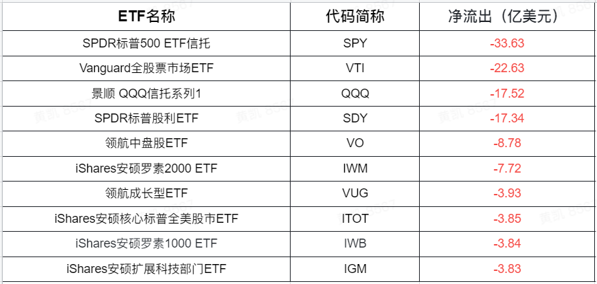 上周SPDR标普500 ETF信托流出居前,净流出33.63亿美元;其次,Vanguard全股票市场ETF净流出22.63亿美元;