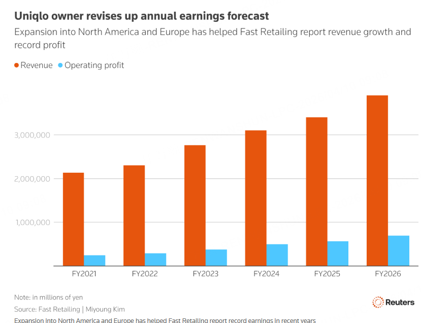 迅销公司表示,在截至2月份的三个月内,其营业利润同比增长29.4%,从去年同期的1467亿日元增至1898亿日元(约合11.9亿美元)。这一数字超过了伦敦证券交易所集团(LSEG)对七位分析师调查所得的平均预期1616亿日元。