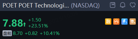 AI光学模块公司 POET Technologies Inc 盘前续涨超10%,昨日大涨超23%,宣布完成7500万美元投资,加速其在AI连接解决方案领域发展。