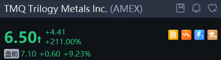 矿业公司 Trilogy Metals Inc. 续涨超9%,昨日飙升211%。美国政府宣布将收购Trilogy Metals 10%的股份,作为一项3560万美元投资计划的一部分,旨在保障阿拉斯加州的关键能源与采矿项目。