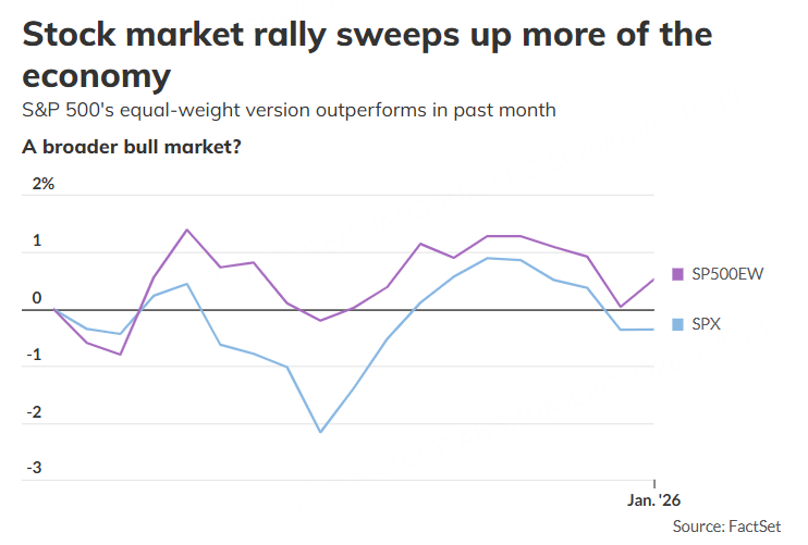 这一点可以从过去一个月更多元化的标普500等权重指数与以科技股为核心的标普500指数的表现对比中看出。