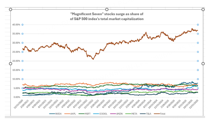 七大科技巨头的合计市值占标普500指数市值的比例从五年前的26.9%升至2025年底的36.9%。