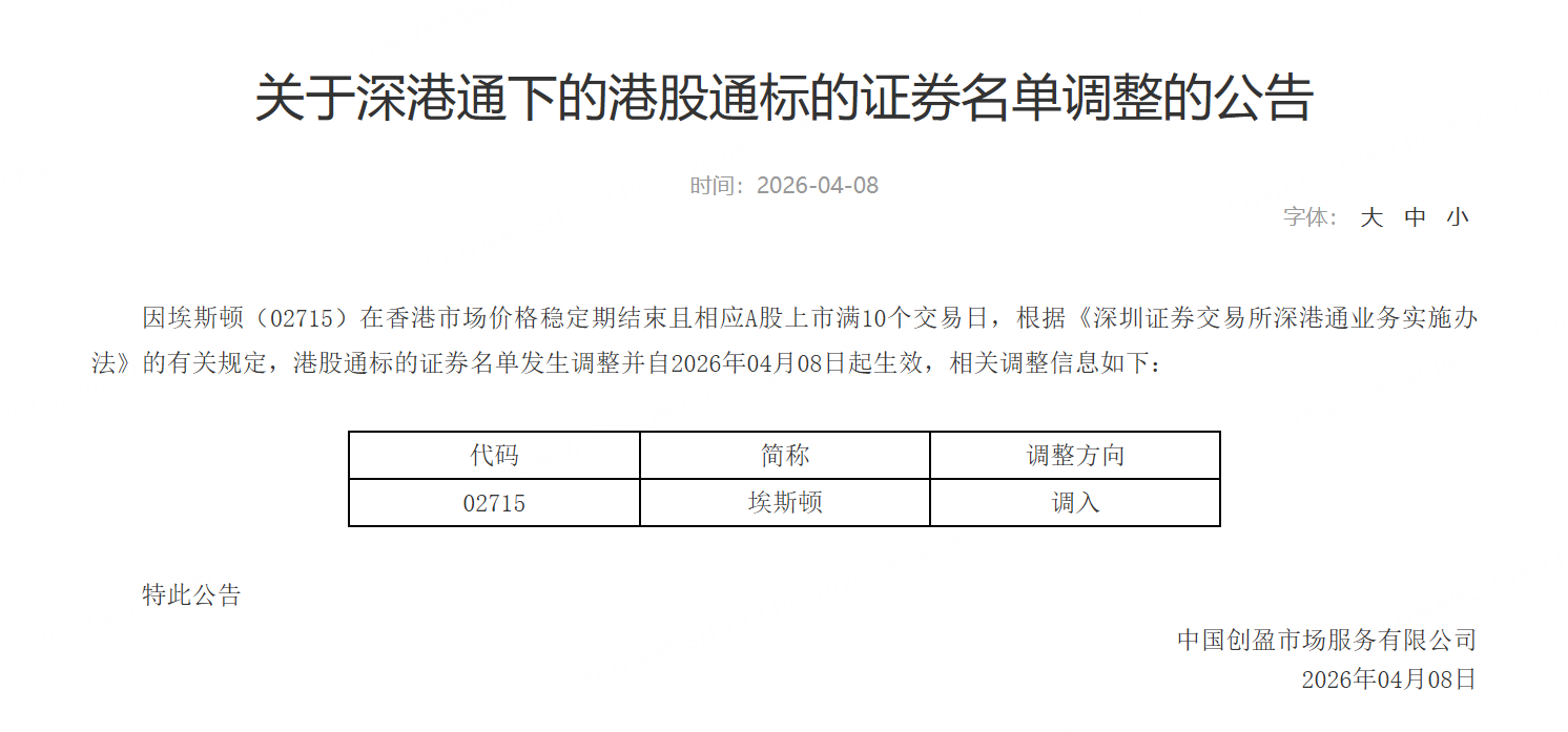 深交所公告,因埃斯顿(02715)在香港市场价格稳定期结束且相应A股上市满10个交易日,根据《深圳证券交易所深港通业务实施办法》的有关规定,港股通标的证券名单调入埃斯顿,自2026年04月08日起生效。
