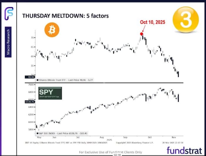 Tom Lee表示:“比特币在10月10日见顶。我们知道那次见顶与一次加密货币的清算事件有关,但之后一直在持续下跌。而标普500在10月29日见顶,约晚了三周。”Tom Lee同时还是以太坊财政管理公司及比特币矿商 BitMine Immersion Technologies Inc. (BMNR)的董事长。