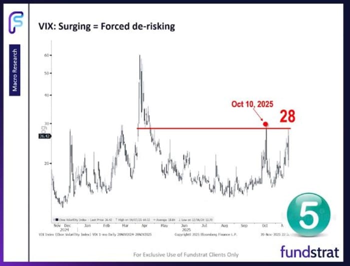 最后的一个因素是 标普500波动率指数(VIX),也就是“恐惧指数”。Tom Lee指出,该指数在周四早盘大幅下挫后又飙升至 28,创一个月新高。