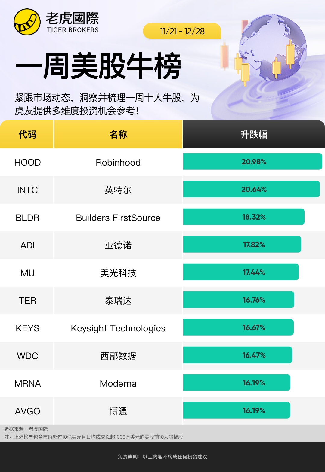 上周哪些股票表现优异?以下是截至 11月28日 五个交易日 标普500指数涨幅前10名 的股票: