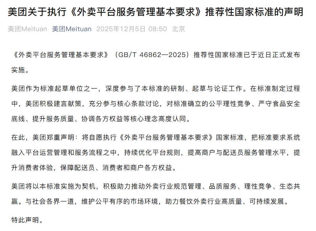 12月5日,《外卖平台服务管理基本要求》(GB/T46862—2025)推荐性国家标准已于近日正式发布实施。美团作为标准起草单位之一,深度参与了本标准的研制、起草与论证工作。