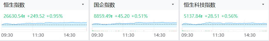 2月27日,港股三大指数集体收涨。恒生指数涨0.95%,恒生科技指数涨0.56%,国企指数涨0.51%。
