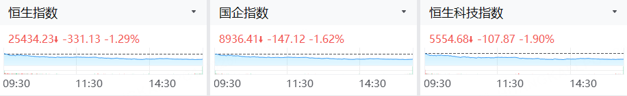 港股三大指数齐跌, 恒生指数跌1.29%,恒生科技指数跌1.90%,国企指数跌1.62%。