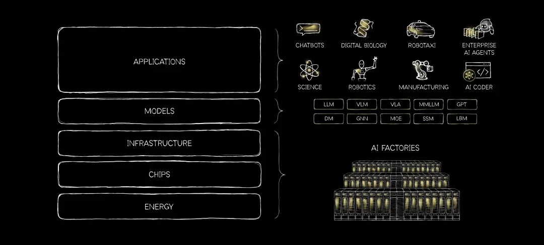 如今,AI 工厂正在兴建,因为智能已实现实时生成。芯片正在被重新设计,因为效率决定了智能的扩展速度。能源成为核心要素,因为它从根本上决定了智能的生产规模上限。应用加速发展,因为底层模型已跨越门槛,得以大规模投入使用。