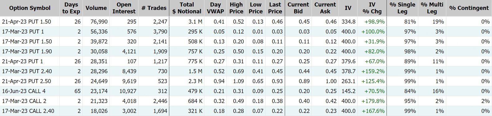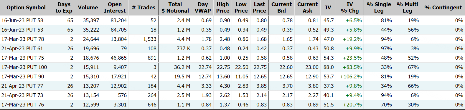 瑞士信贷隔夜大跌近14%,消息面,其最大股东沙特国家银行表示,绝不会向瑞信提供更多援助。瑞士信贷期权成交83.66万张,较90日平均成交量放大45倍,其中看跌期权占比58.8%;