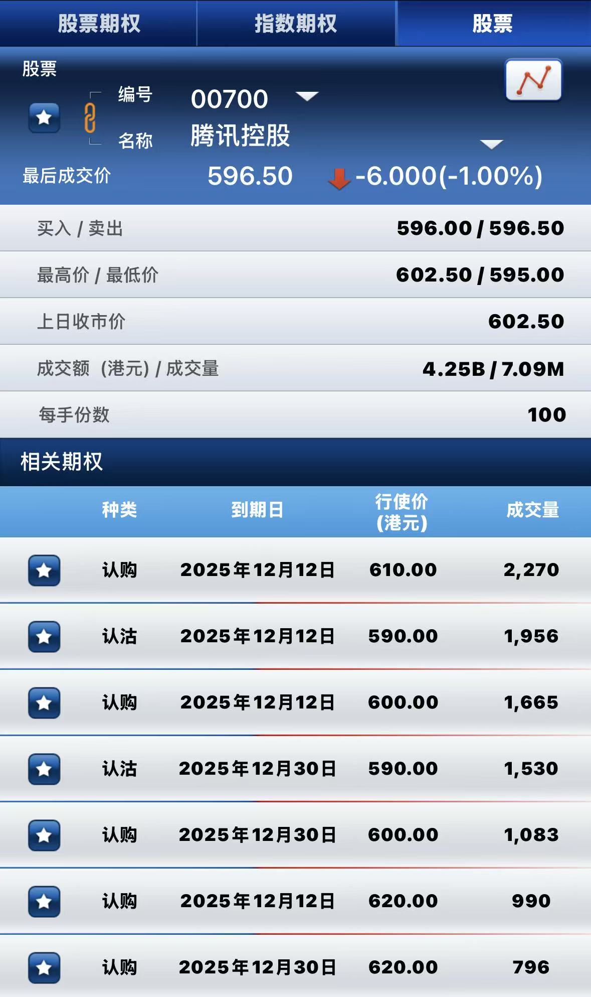 腾讯控股下跌1%,期权方面:半日成交超2.6万张合约,其中于12月12日到期行权价610港元的认购期权成交量居前,成交超2200张合约。 $TCH.HK 20251212 610.00 CALL$