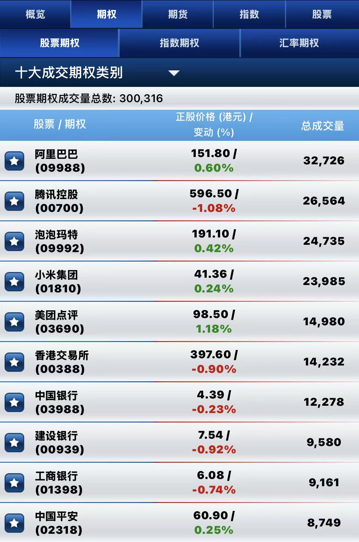 截止午间收盘,港股期权半日成交超30万张。其中,阿里巴巴-W成交量居前,期权成交超3.2万张;腾讯控股名列次席,期权成交超2.6万张;泡泡玛特位居第三,期权成交超2.4万张。