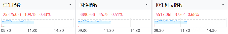 12月10日,港股三大股指小幅下跌,截止午间收盘,恒生指数跌0.43%,恒生科技指数跌0.68%,国企指数跌0.51%。