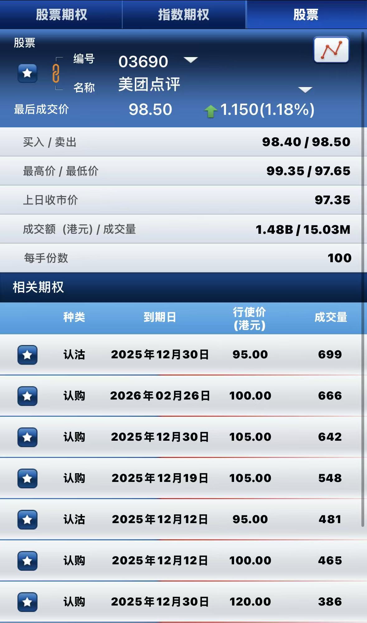 美团-W涨超1%,期权方面:半日成交超1.4万张合约,其中于12月30日到期行权价95港元的认沽期权成交量居前,成交近700张合约。 $MET.HK 20251230 95.00 PUT$