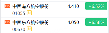 4月15日,港股航空股盘初全线上涨,中国东方航空股份、中国南方航空股份涨超6%,中国国航涨超5%,国泰航空涨超3%。
