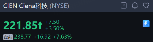 Ciena科技 涨超7%。2025财年第四财季调整后每股收益 0.91 美元,高于分析师一致预期的 0.78 美元。收入为 13.5 亿美元,比去年同期增长 20%,也高于华尔街预期的 12.9 亿美元。