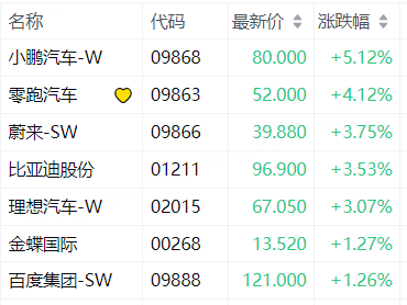 科指成分股中,小鹏汽车-W涨5.12%,零跑汽车涨4.12%,蔚来-SW涨3.75%,比亚迪股份涨3.53%,理想汽车-W涨3.07%。