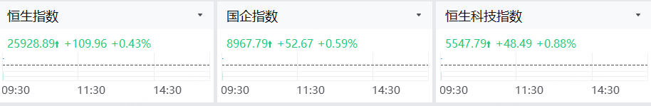12月29日,港股三大指数高开,恒指涨0.43%,国指涨0.59%,恒生科技指数涨0.88%。