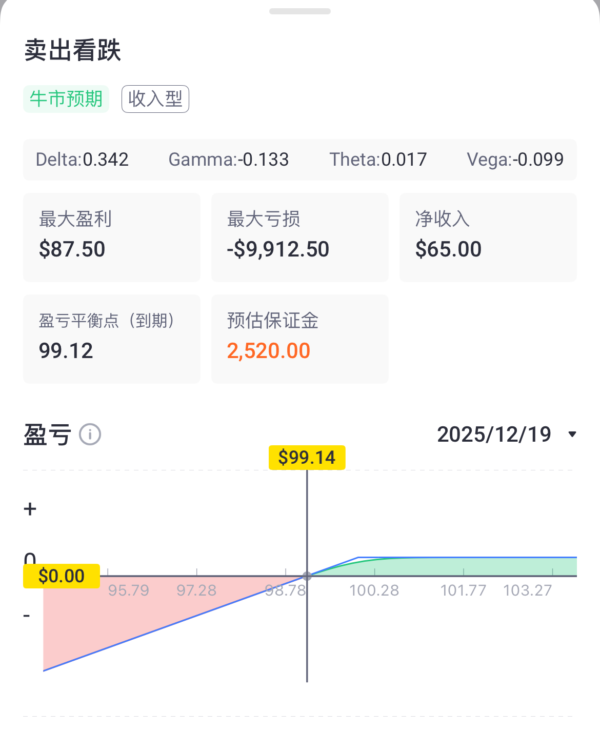 盈亏平衡点:行权价 - 权利金收益 = 99.12
