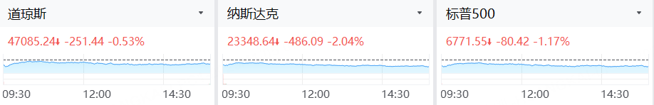 周二,美股三大指数集体重挫,截至收盘。标准普尔500指数跌1.17%,报6771.55点;纳斯达克综合指数跌2.04%,报23348.64点;道琼斯工业平均指数跌0.53%,报47085.24点。