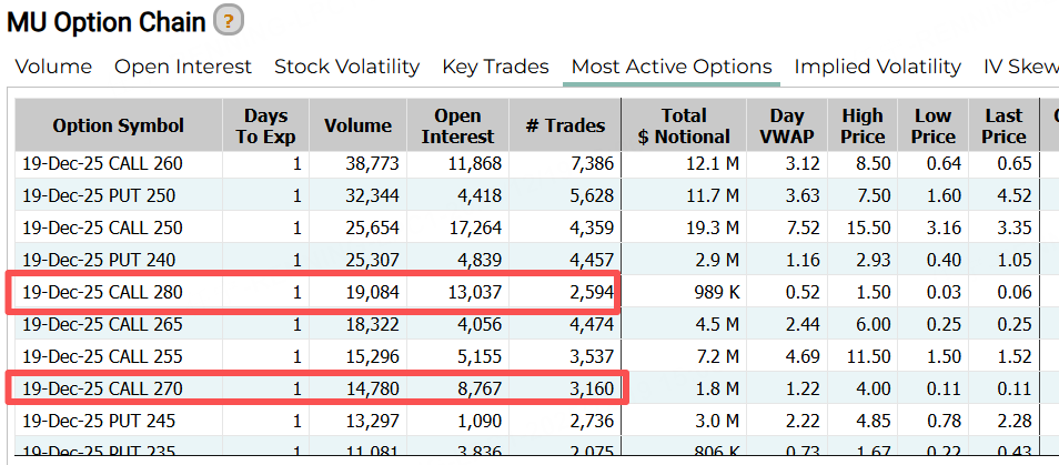 昨日美光的前十大期权成交中,两张本周五到期的CALL,行权价分别达到270、280美元。
