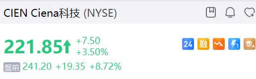 Ciena 股价在周四盘前上涨 8.72%。截至周三收盘,今年以来股价已飙升 162%,受益于强劲的业绩表现,以及对人工智能与云计算带宽需求的激增。