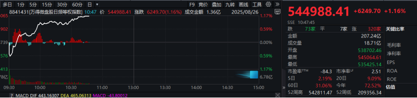 经历了8月25日的3万亿元爆量之后,8月26日早盘,A股市场突然迎来风格变化。近期表现强劲的科创板指数一度大跌超2%,北证指数一度跌近1%,几个主要指数全线走弱,寒武纪一度大跌超6%。近期偏弱的微盘股指数反而意外地大涨超1%。A50和港股也于早盘迎来调整。临近午盘时,涨势较好的30年国债期货也跳水。