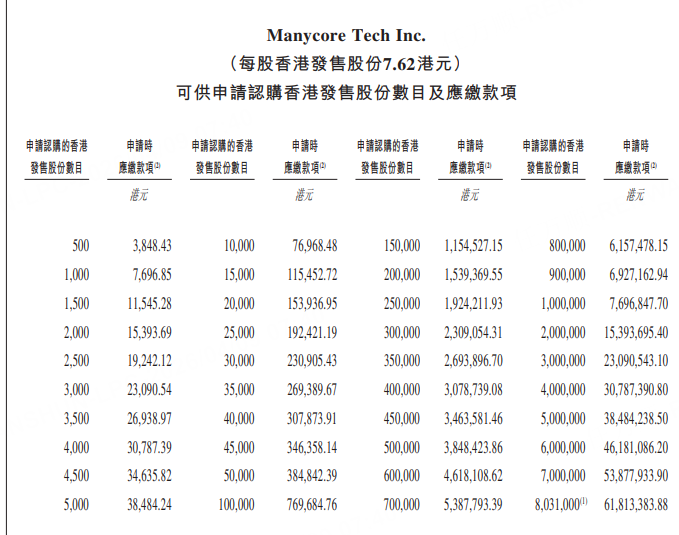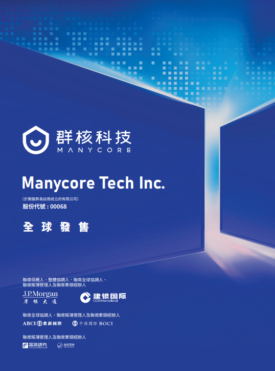 MANYCORE TECH(00068)今日(4月9日)至4月14日招股,拟全球发售1.606亿股,香港公开发售占约10%,国际发售占约90%,另有约15%超额配股权。发售价为每股发售股份6.72-7.62港元,每手500股,一手入场费3848.43港元,预期股份将于2026年4月17日上午九时正开始在联交所买卖。