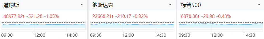 截至收盘,标普500指数跌0.43%,报6878.88点;纳斯达克综合指数跌0.92%,报22668.21点;道琼斯工业平均指数跌1.05%,报48977.92点。