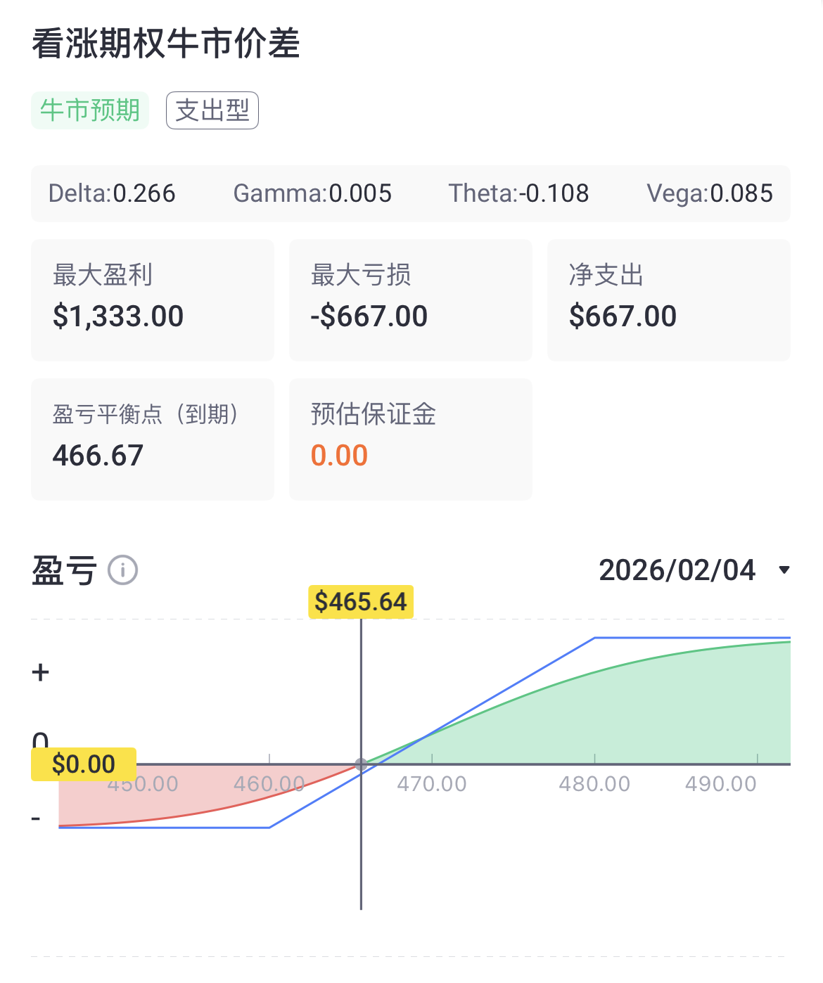 最大亏损:667美元(价格 ≤ 460 美元时)
