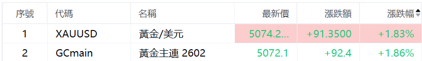 黄金价格于周一飙升至每盎司5000美元以上的历史新高,在地缘政治紧张局势和全球财政风险加剧的背景下,投资者持续涌入避险资产,推动贵金属延续破纪录涨势。现货黄金与二月交割的美国黄金期货上涨1.83%和1.86,分别报每盎司5074美元和5072美元。