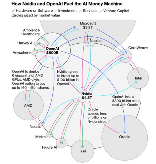 目前,英伟达、OpenAI、甲骨文等企业之间已经建立了深度的业务合作,涵盖投资、云服务、芯片部署及联合研发等多个维度。相关企业相互“绑定”,已经形成了紧密的关联网络(图表4)。例如,英伟达一方面同意向OpenAI投资至多1000亿美元,另一方面向CoreWeave采购价值63亿美元的云服务,同时还向英特尔投资50亿美元并计划联合研发芯片。OpenAI则不仅与甲骨文签署了价值3000亿美元的云计算合作协议,还计划向CoreWeave支付至多224亿美元,并同意部署价值数十亿美元的AMD芯片。