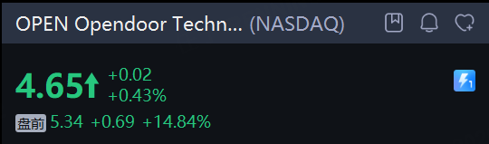 Opendoor Technologies Inc 盘前大涨近15%。第四季度营收和调整后EBITDA均超市场预期,房屋购买量环比增长46%。