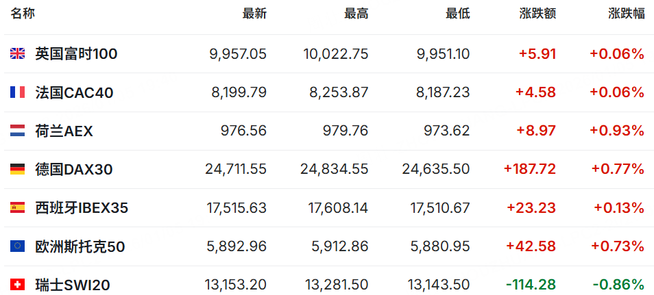 欧洲主要股指多数上涨,截至发稿,英国富时100涨0.06%,法国CAC40涨0.06%,德国DAX30指数涨0.77%。