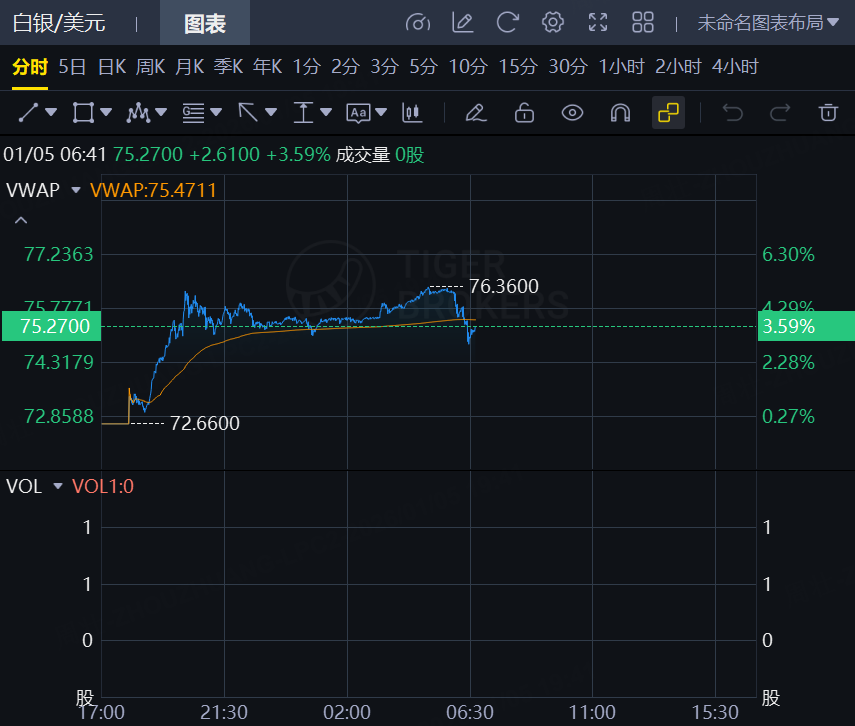 现货黄金日内走高,截止发稿,涨2.13%,报4422.68美元/盎司;现货白银大涨,截止发稿,涨3.59%,报75.27美元/盎司。