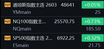 1月5日,美股三大股指期货齐涨,截止发稿,道指期货涨0.05%,纳指期货涨0.73%,标普500指数期货涨0.32%。