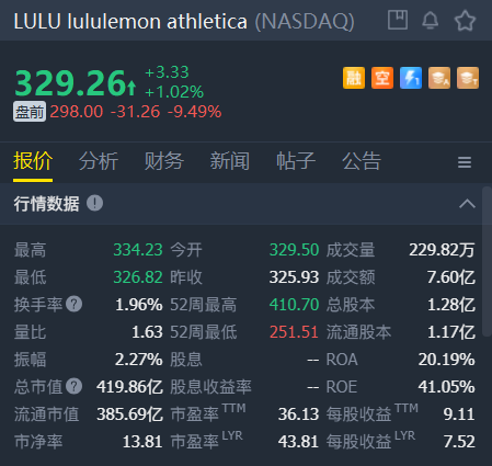 Lululemon盘前跌10%,下调第四季度EPS指引