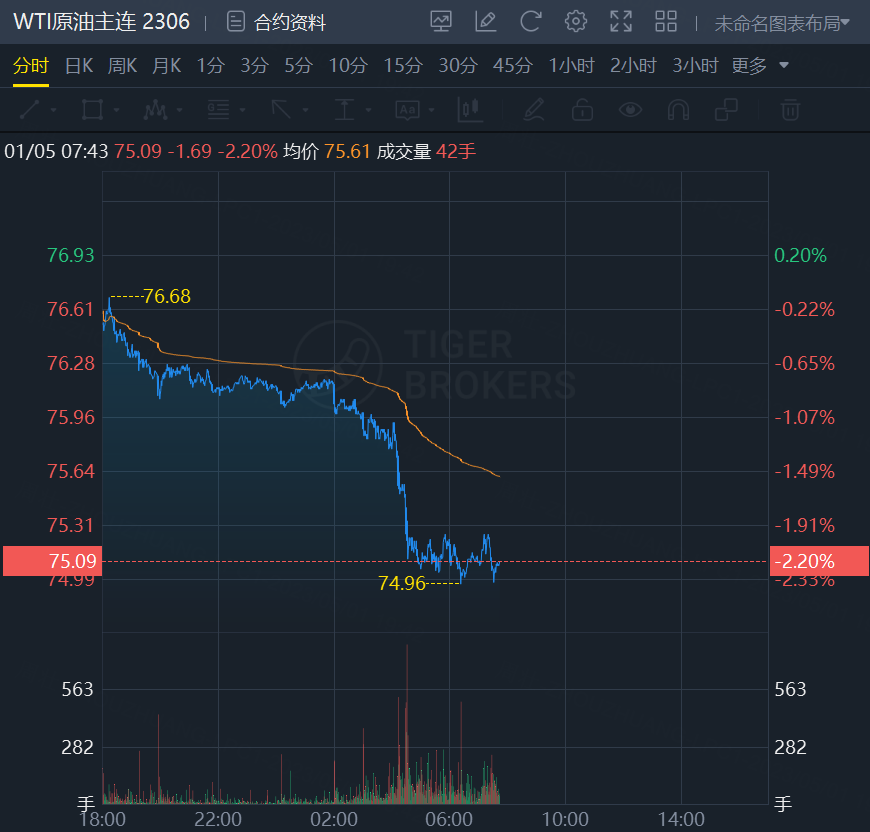 原油期货震荡走低,截止发稿,WTI原油跌2.2%,报75.09美元/桶;布伦特原油跌2%,报78.72美元/桶。
