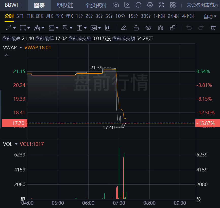 11月20日,Bath & Body Works美股盘前大跌近16%!公司下调全年销售增长预期并公布季度业绩低于预期。
