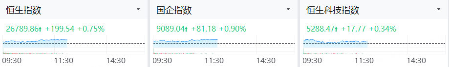 2月25日,港股三大指数齐涨,截止午间收盘,恒指涨0.75%,科指涨0.34%,国指涨0.90%。